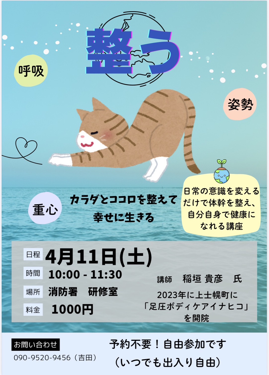 ◎4月11日『整う教室』を上士幌消防署にて10時から90分行っています。足圧の時にお伝えできない心身のこと、日常の意識など、身体を通じてお伝えしています。
